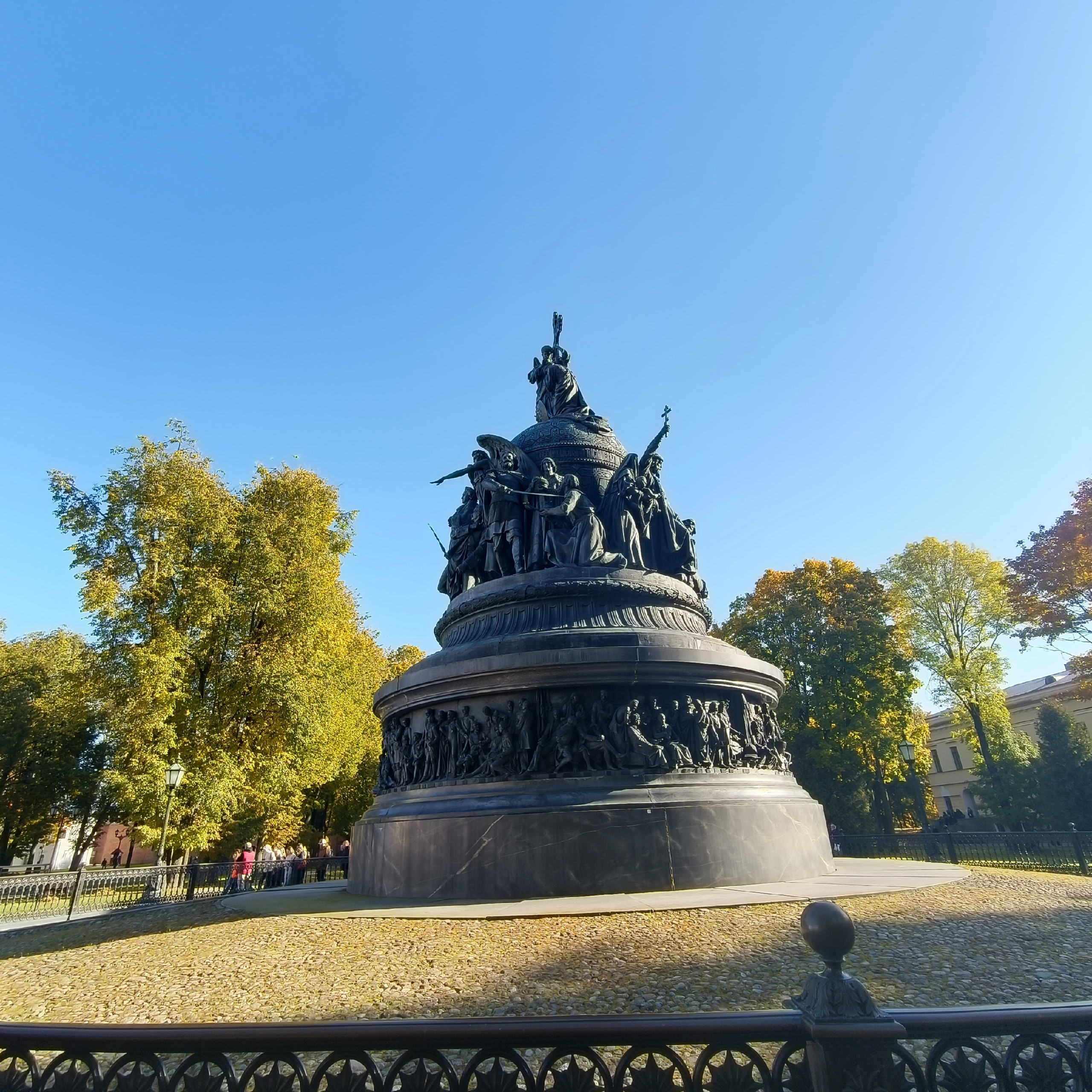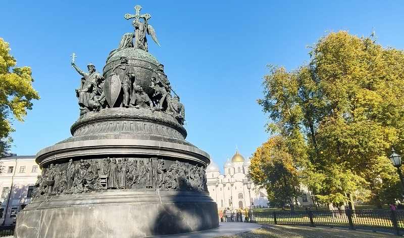 У вас есть отличная возможность рассмотреть по-настоящему эпохальное творение скульпторов Микешина, Гартмана и Шредера. Памятник «Тысячелетие России» находится в дворе Новгородского Детинца и представляет собой шар-державу, на которой изображены 128 фигур людей, сыгравших значительную роль в истории Руси и Российской империи.